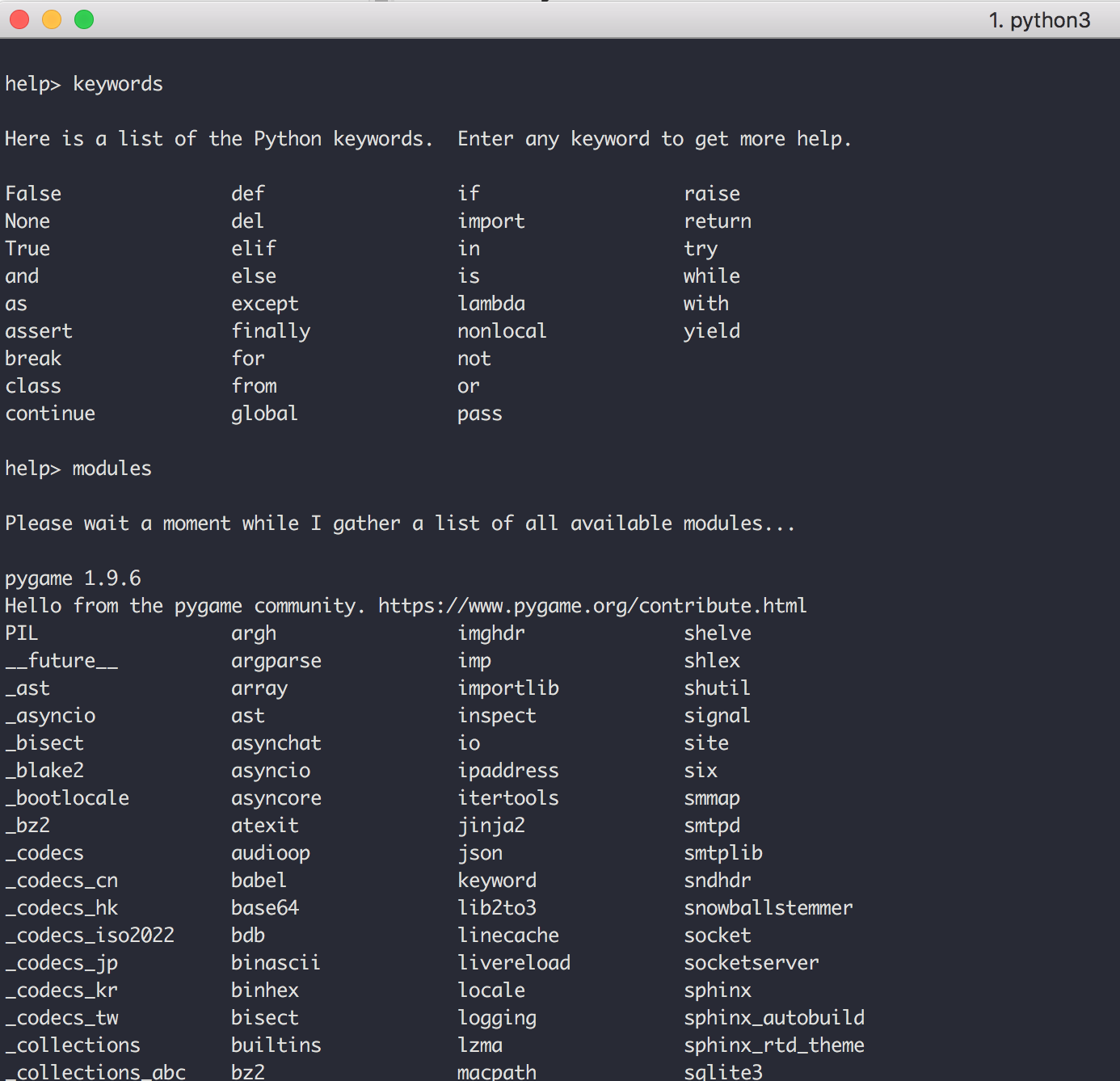 比如我输入 keywords ,就可以看到 Python 里所有的关键字。再输入 modules 就可以查看 Python 中所有的内置模块。