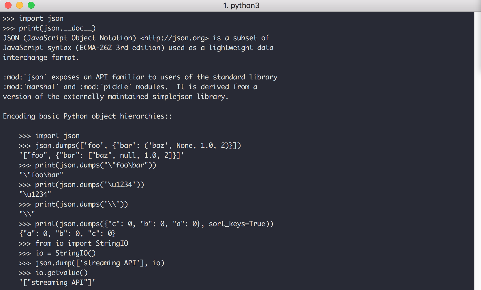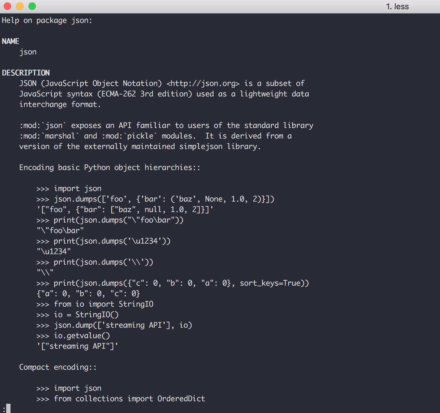如果你想学习某个包要如何使用,可以直接在 help 模式下输入 包名,就像下面这样,我就可以获得一份 json 的帮助文档。