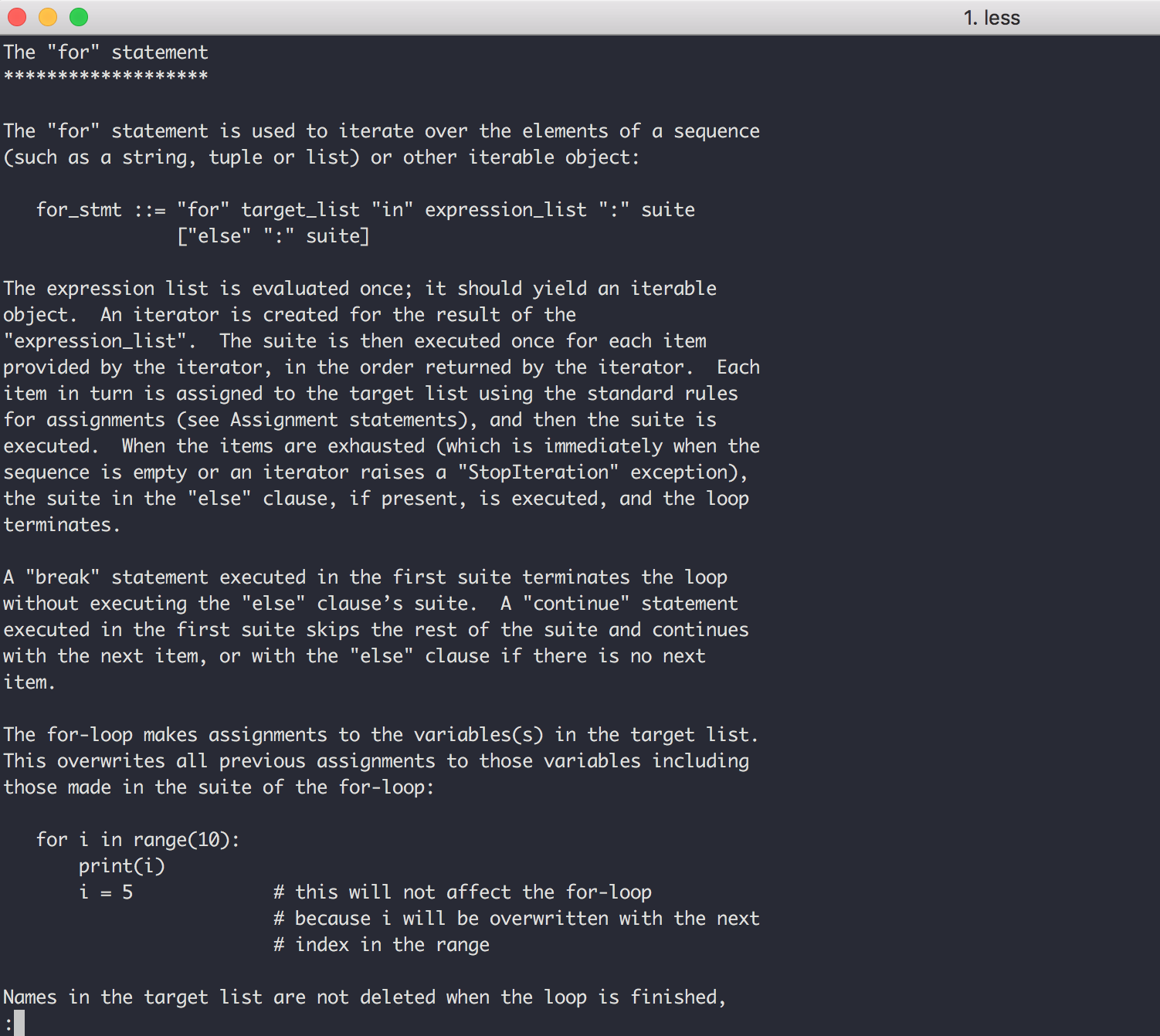 如果你想学习某个关键字的用法,可以在 help 模式下直接键入 关键字 查询用法,比如我直接键入 for