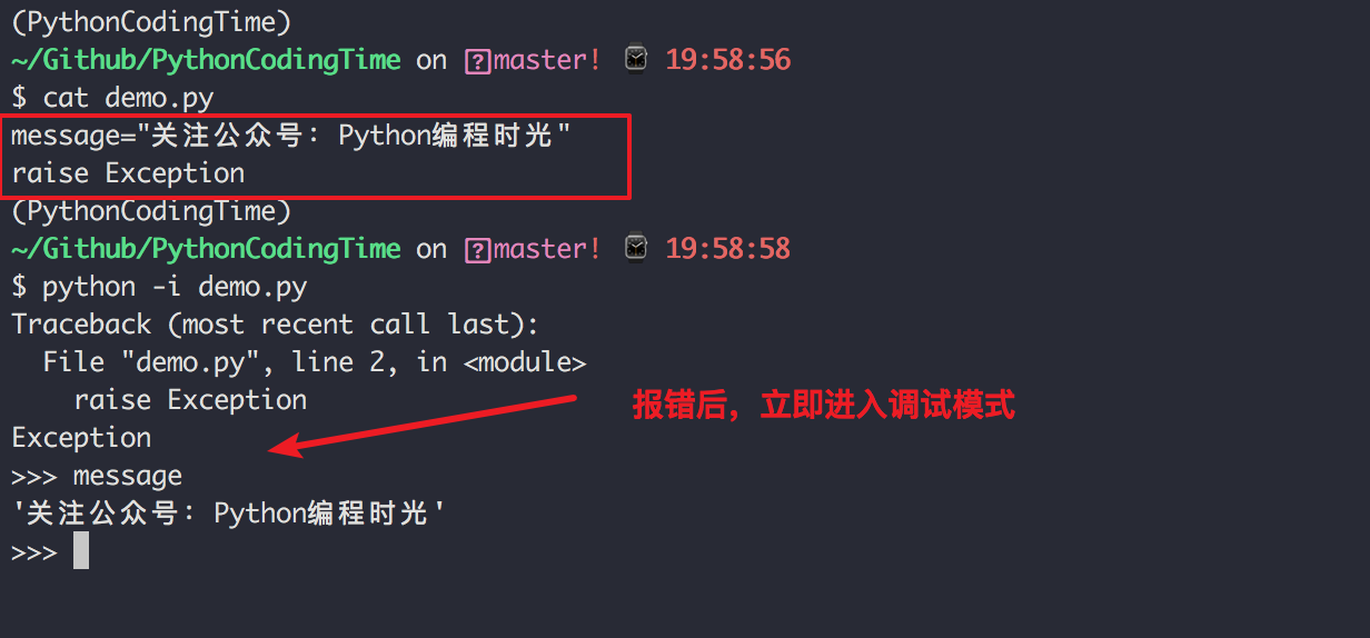 只要你在执行脚本行,加上 -i 参数,即可在脚本执行完毕后进入 Python Shell 模式,方便你进行调试。