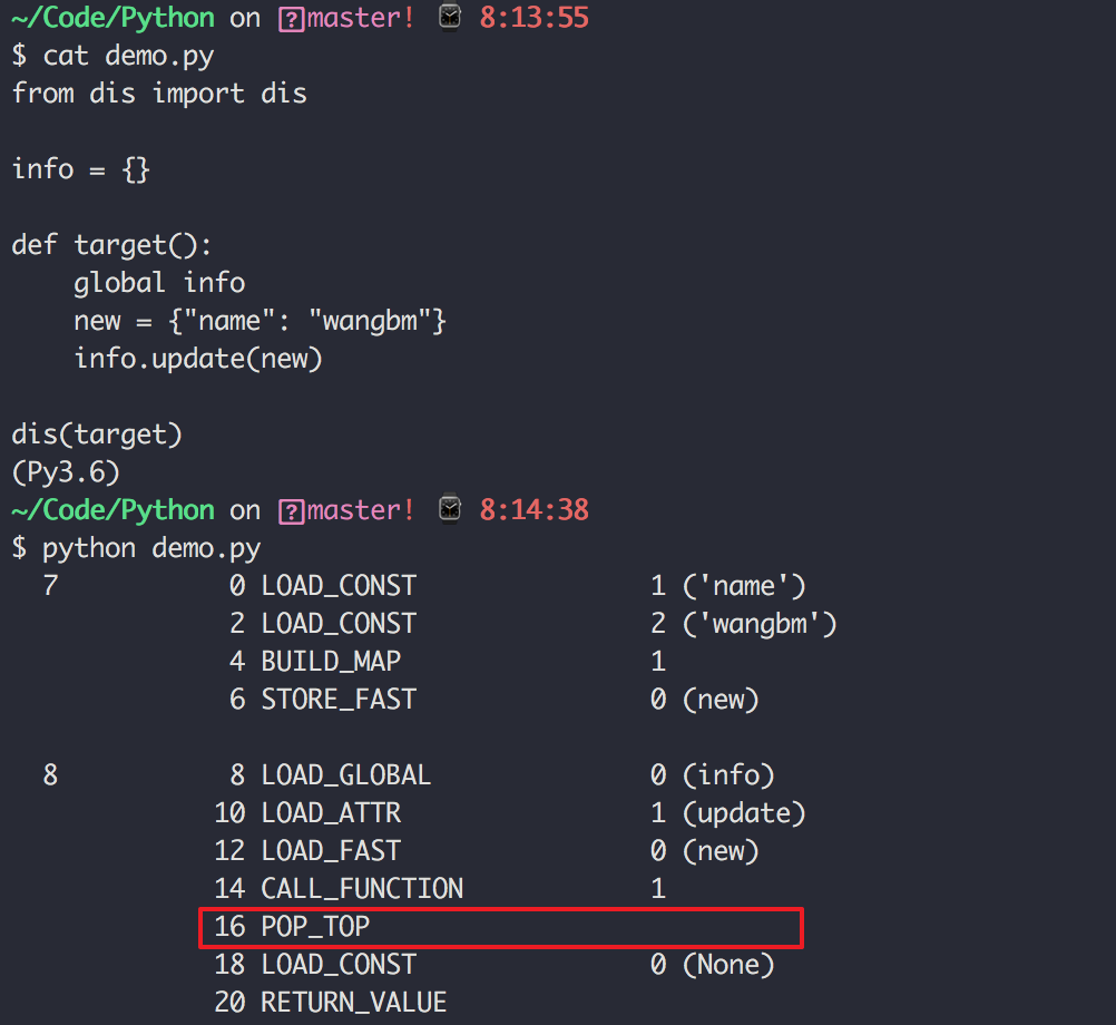 LOAD_GLOBAL:加载全局变量LOAD_ATTR: 加载属性,获取 update 方法LOAD_FAST:加载 new 变量CALL_FUNCTION:调用函数POP_TOP:执行更新操作
