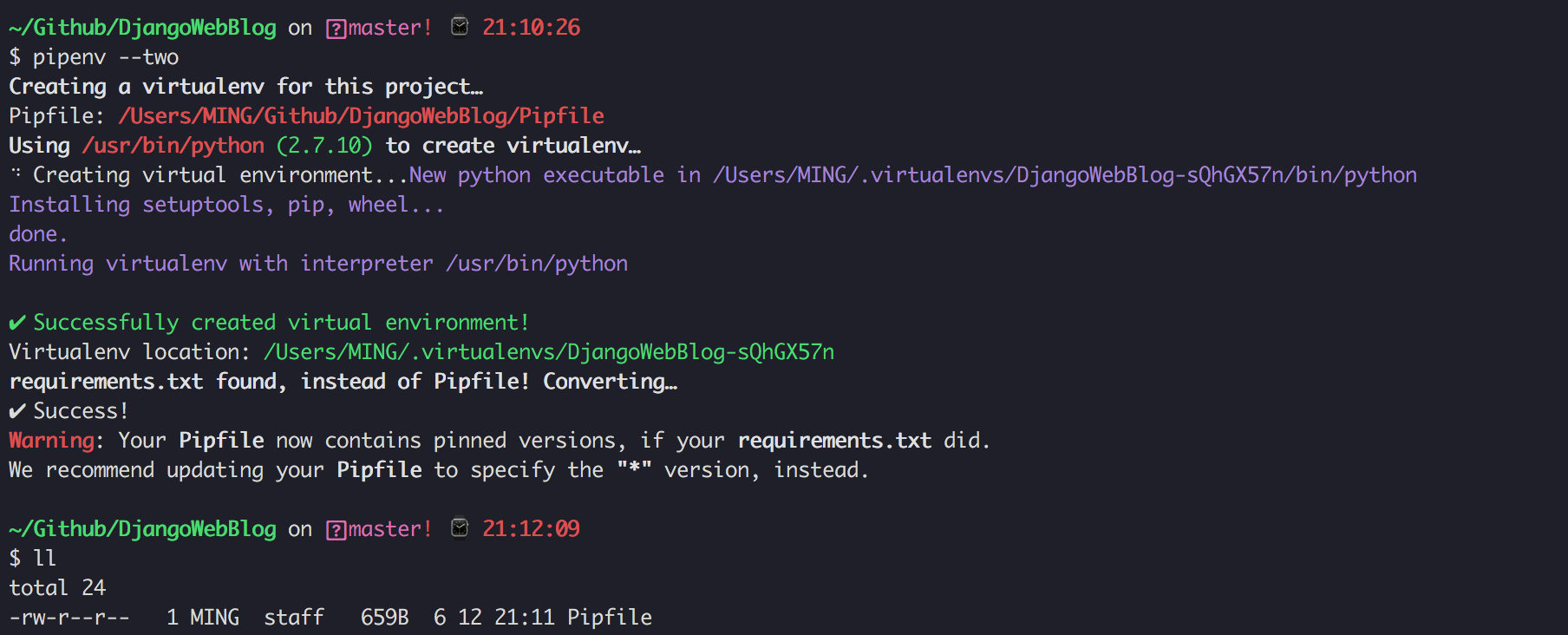 如果你原项目使用的是 requirements.txt 这个管理包的方式,这时候执行 pipenv --tow 创建一个虚拟环境后,会找到 requirements.txt ,并根据这里面的依赖包生成 Pipfile文件。