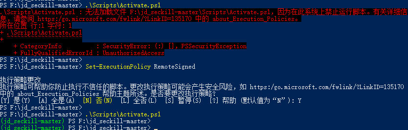 如果你使用PowserShell激活虚拟环境出现如下错误,那要先执行这个命令:Set-ExecutionPolicy RemoteSigned,再按 Y