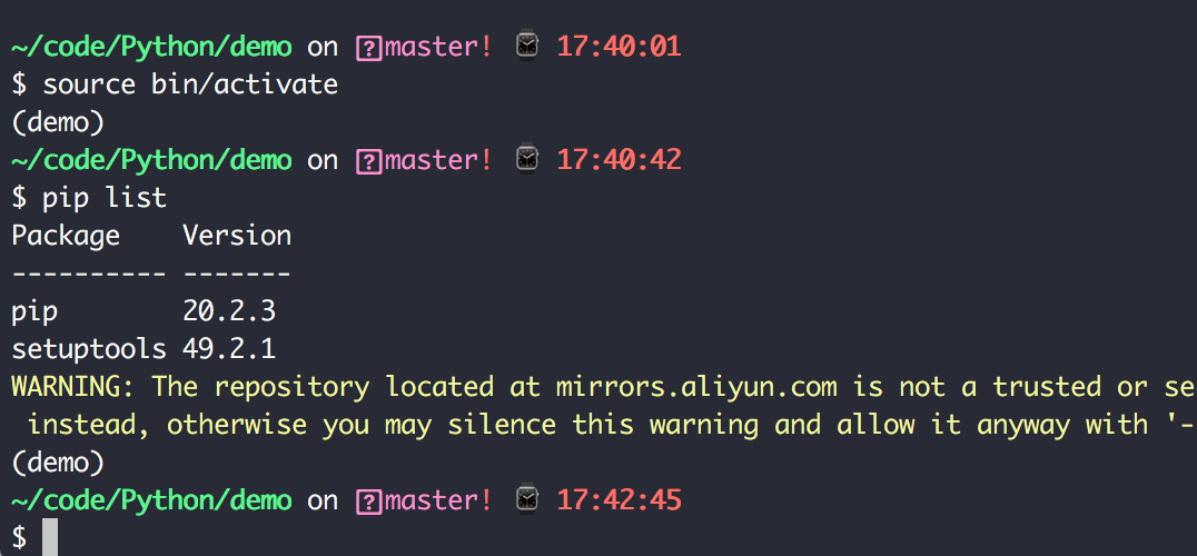 执行完后,若在你的命令行下有 demo 字样(之所以是 demo ,因为我们创建时的目录名就是 demo),说明你已经处于虚拟环境下。 由于虚拟环境是全新的干净环境,此时你使用 pip list ,会看到啥包都没有,只有最基本的 pip 和 setuptools 。