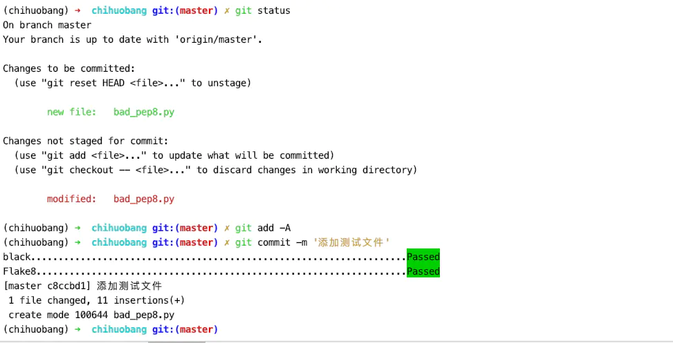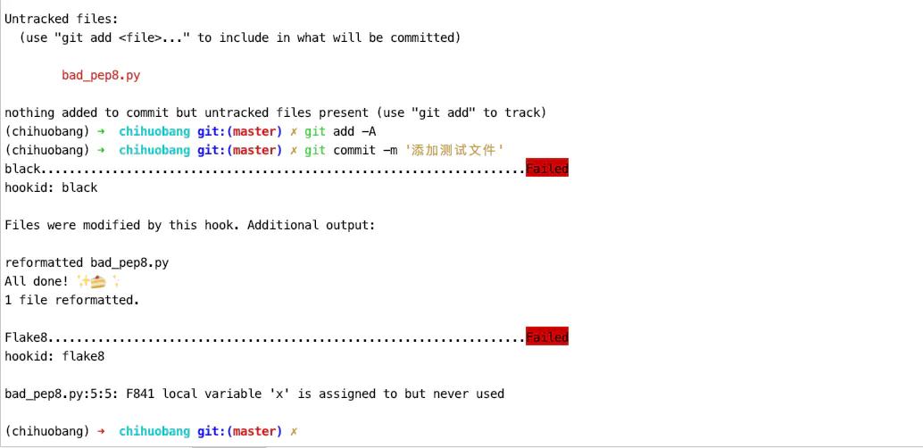 可以看到两个 hook 都没有通过,另外 black帮我们把代码格式化了。