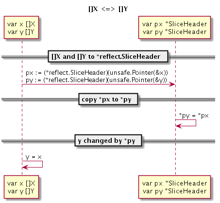 不过 Go 语言的 reflect 包提供了切片类型的底层结构,再结合前面讨论到不同类型之间的指针转换技术就可以实现 []X 和 []Y 类型的切片转换: