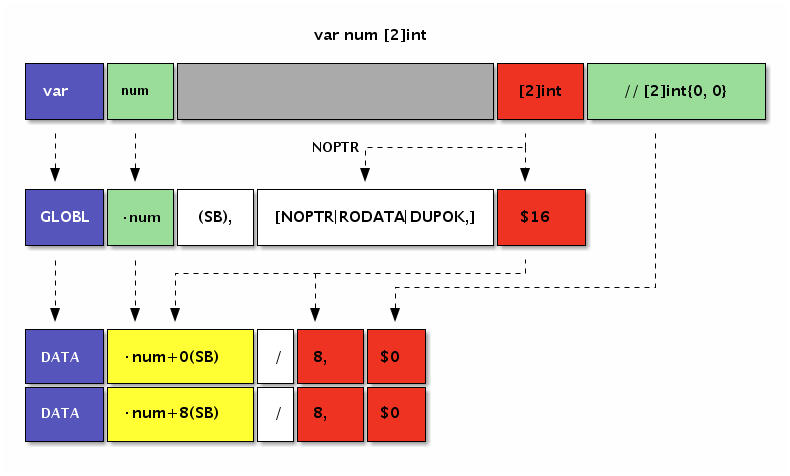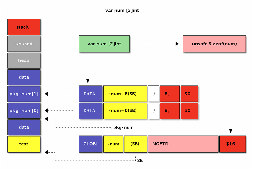 下面我们尝试用汇编定义一个 [2]int 类型的数组变量 num: