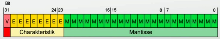 IEEE754 标准中,最高位 1bit 为符号位,然后是指数位(指数为采用移码格式表示),然后是有效数部分(其中小数点左边的一个 bit 位被省略)。下图是 IEEE754 中 float32 类型浮点数的 bit 布局: