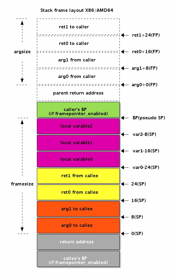 和 C 语言函数不同,Go 语言函数的参数和返回值完全通过栈传递。下面是 Go 函数调用时栈的布局图: