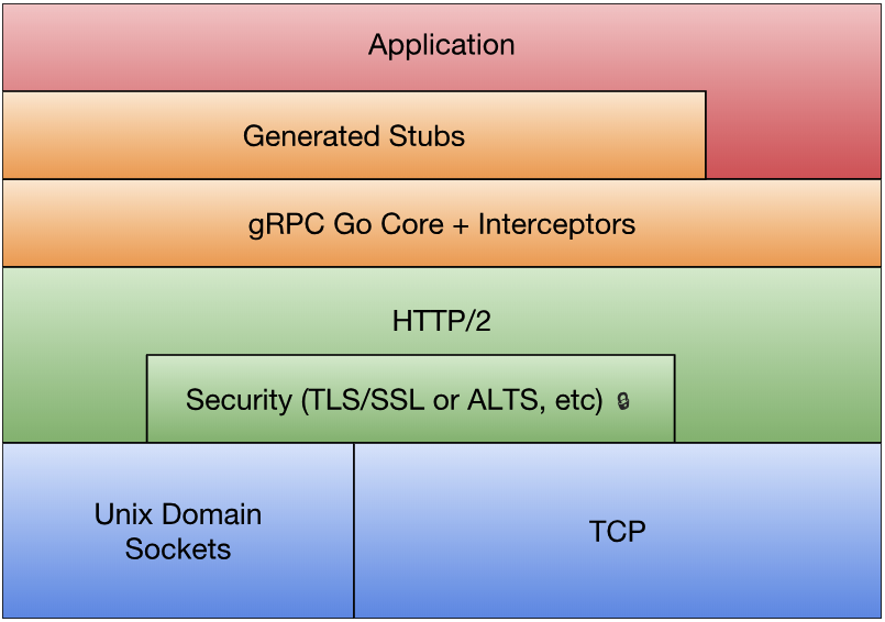 最底层为 TCP 或 Unix Socket 协议,在此之上是 HTTP/2 协议的实现,然后在 HTTP/2 协议之上又构建了针对 Go 语言的 gRPC 核心库。应用程序通过 gRPC 插件生产的 Stub 代码和 gRPC 核心库通信,也可以直接和 gRPC 核心库通信。