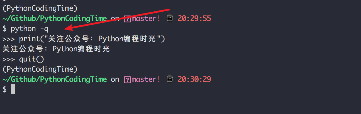 如果你和我一样不喜欢这种 『牛皮癣』,那么可以加个 -q 参数,静默进入 Python Shell,就像下面这样子,开启了极简模式,舒服多了。