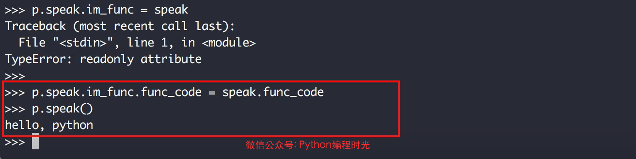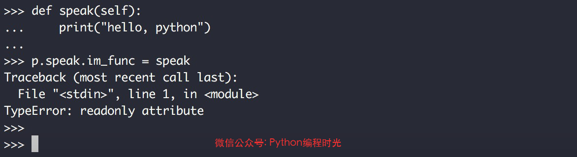 因为在 Python2 中不推荐普通用户对类实例的方法进行替换,所以 Python 给类实例的方法赋予了只读属性