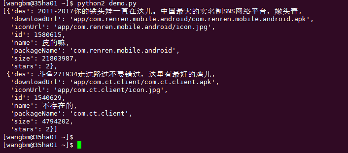 >>> info = [{"id":1580615,"name":u"皮的嘛","packageName":"com.renren.mobile.android","iconUrl":"app/com.renren.mobile.android/icon.jpg","stars":2,"size":21803987,"downloadUrl":"app/com.renren.mobile.android/com.renren.mobile.android.apk","des":u"2011-2017你的铁头娃一直在这儿。中国最大的实名制SNS网络平台,嫩头青"},{"id":1540629,"name":u"不存在的","packageName":"com.ct.client","iconUrl":"app/com.ct.client/icon.jpg","stars":2,"size":4794202,"downloadUrl":"app/com.ct.client/com.ct.client.apk","des":u"斗鱼271934走过路过不要错过,这里有最好的鸡儿"}]