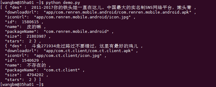 >>> info = [{"id":1580615,"name":"皮的嘛","packageName":"com.renren.mobile.android","iconUrl":"app/com.renren.mobile.android/icon.jpg","stars":2,"size":21803987,"downloadUrl":"app/com.renren.mobile.android/com.renren.mobile.android.apk","des":"2011-2017你的铁头娃一直在这儿。中国最大的实名制SNS网络平台,嫩头青"},{"id":1540629,"name":"不存在的","packageName":"com.ct.client","iconUrl":"app/com.ct.client/icon.jpg","stars":2,"size":4794202,"downloadUrl":"app/com.ct.client/com.ct.client.apk","des":"斗鱼271934走过路过不要错过,这里有最好的鸡儿"}]
