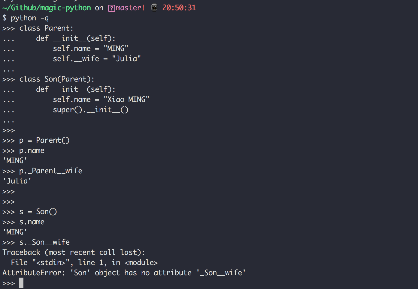 从上面的代码中,可以看到 Son 类的实例并没有初始化 __wife 属性,虽然 Parent 类的实例有该属性,但由于这个属性是父类私有的,子类是无法访问的。因此当子类想要访问时,是会提示该变量不存在。