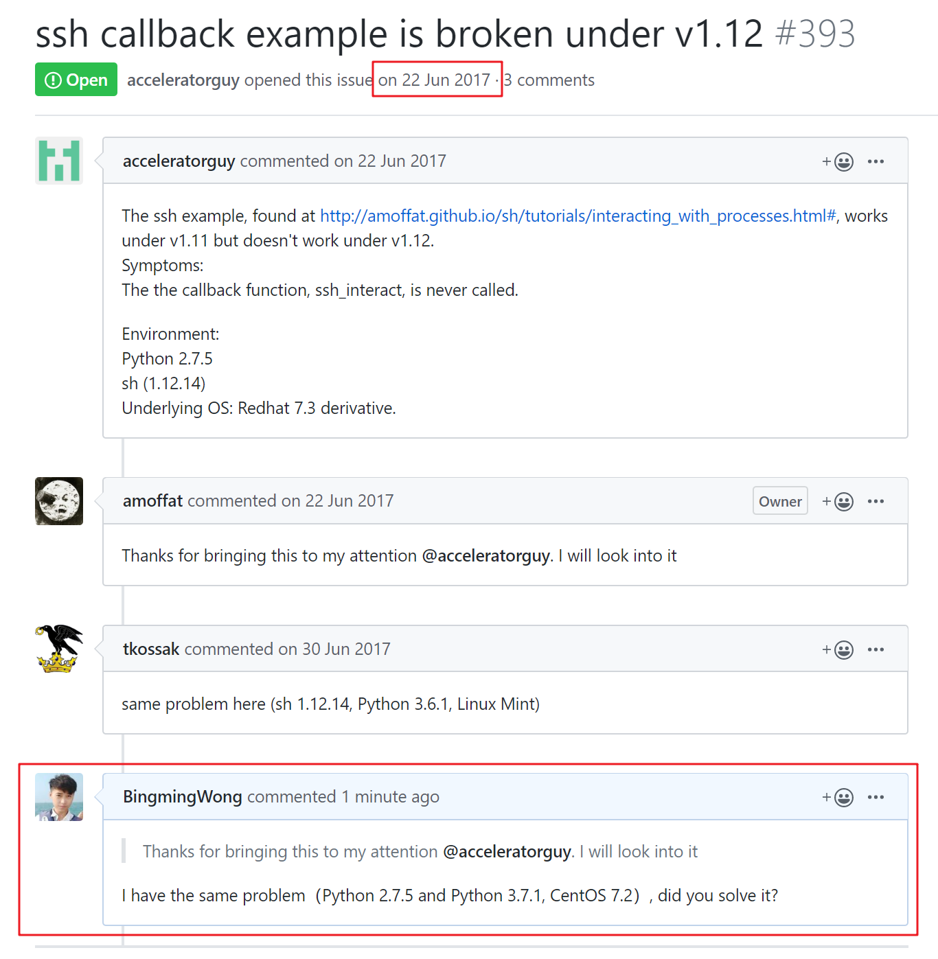 通过调试查看源代码,仍然查不到问题所在,于是去 Github 上搜了下,原来在 2017 年就已经存在这个问题了,到现在 2020 年了还没有修复,看来使用 sh.ssh 的人并不多,于是我又“追问”了下,期望能得到回复。