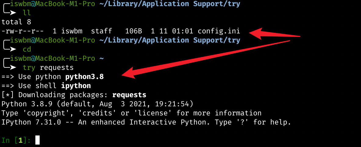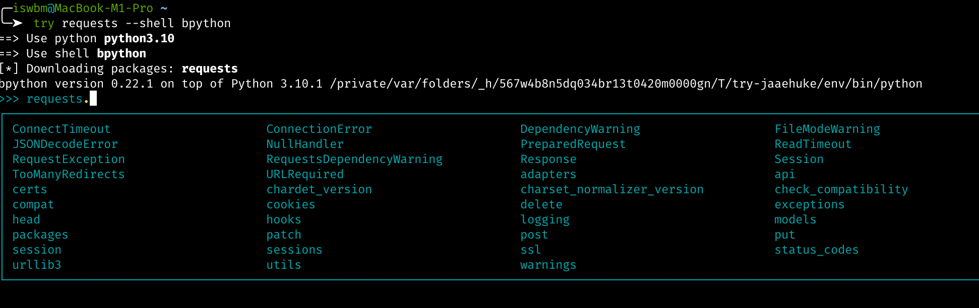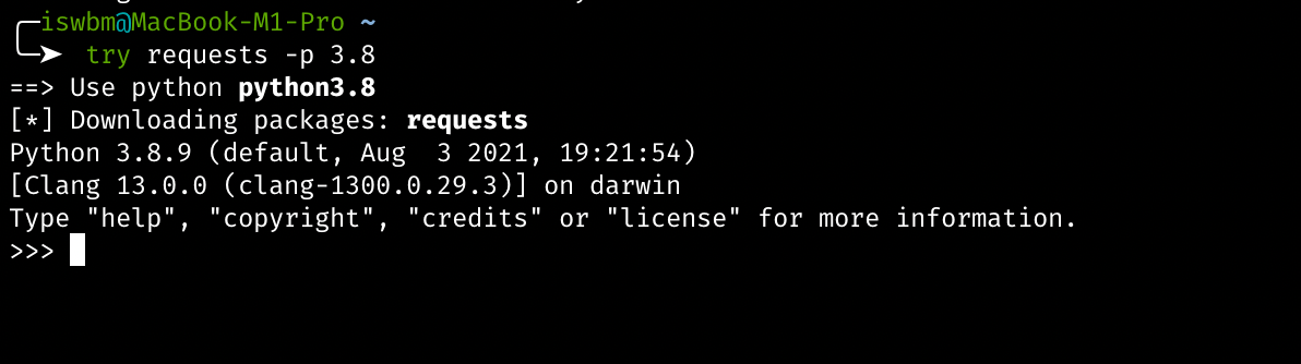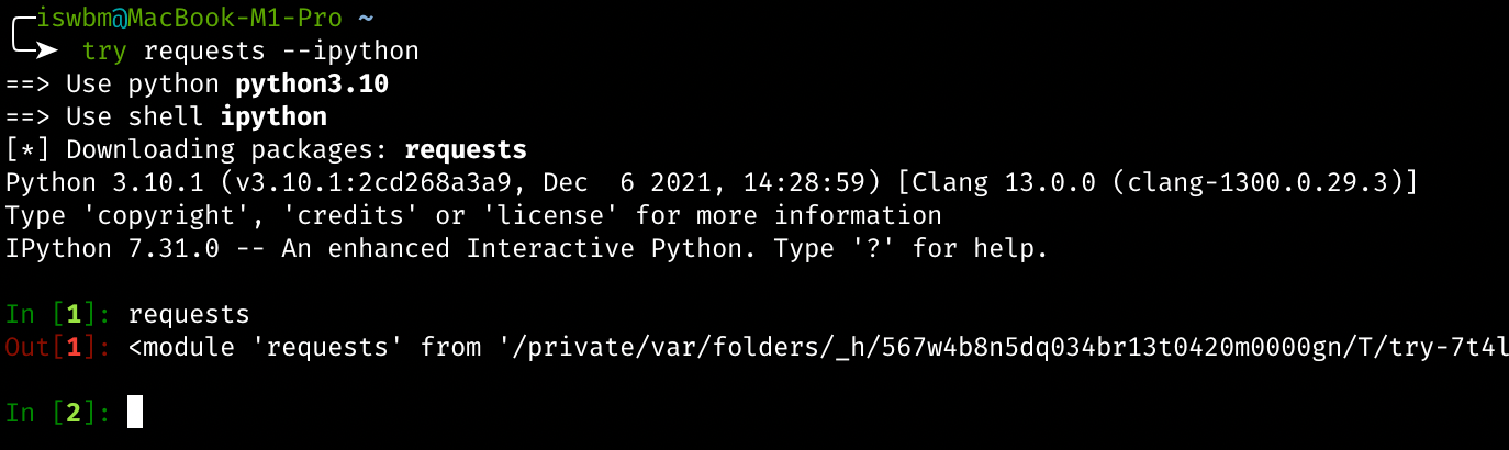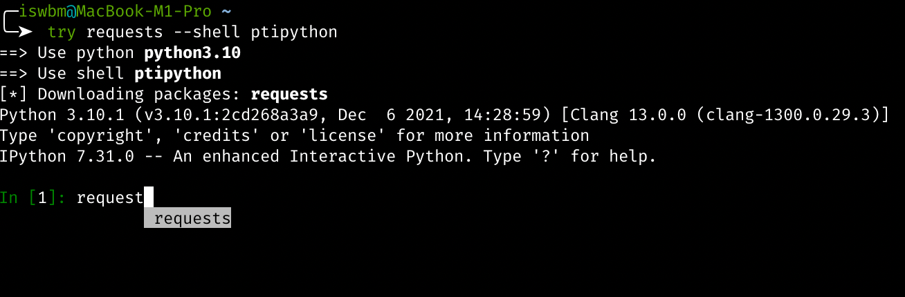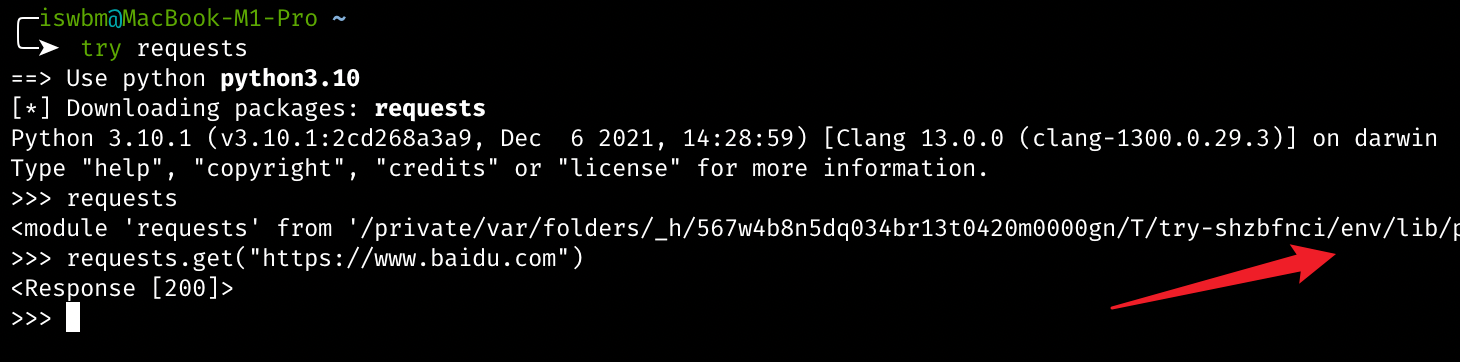 使用 try requests,try 就会创建一个虚拟环境,然后在该虚拟环境中,安装 requests ,安装完成后,自动进入 Python Shell 的模式,并且自动导入好你要试用的包